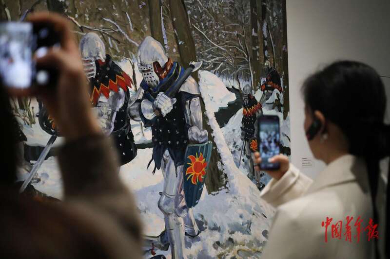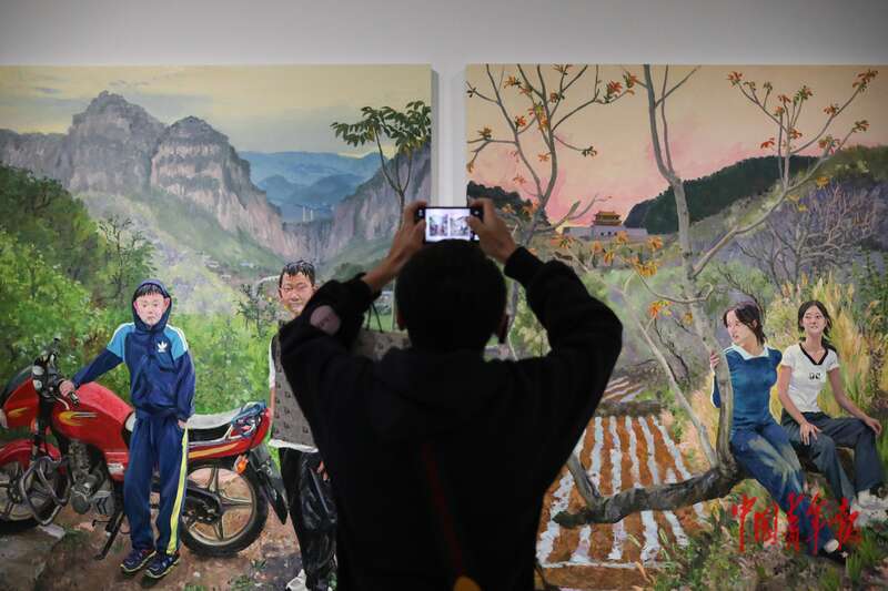 11月23日,北京泰康美术馆,刘小东大型个展“河东,河西”现场,一名参观者在拍摄刘小东2025年的新作《少年通天》和《天门关》。这两件新作描绘了革命老区太行山的“Z世代”少年,他们的姿态、目光和精神气质,与往昔的记忆之间形成了隐秘的回响。2025年11月25日至2026年3月31日,中国当代知名艺术家、中央美术学院油画系教授刘小东的大型回顾展“河东,河西”将于泰康美术馆展出。展览展出了刘小东自20世纪70年代末至2025年的70余件原作,呈现了画家对时代气息的捕捉和描绘,以及用绘画对现实的回应。中青报·中青网记者 孔斯琪/摄