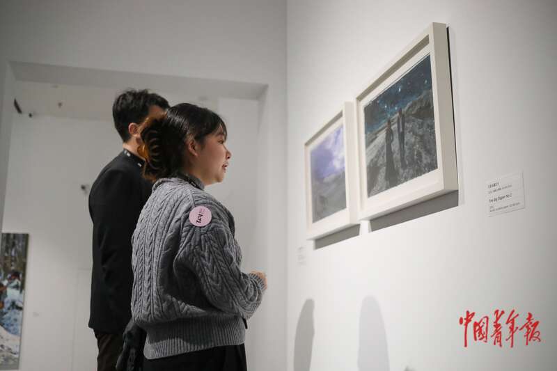 11月23日,北京泰康美术馆,刘小东大型个展“河东,河西”现场,两名参观者在观看刘小东的两件结合了绘画和摄影的作品。中青报·中青网记者 孔斯琪/摄