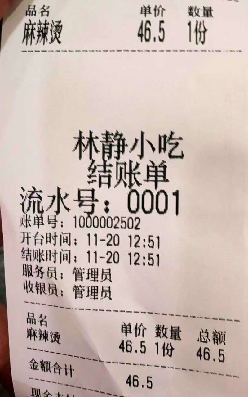 比如林静小吃,这家店在互联网上以“好吃但不便宜”著称。该店食材种类众多,每到饭点必然排队。店里计价方式比较复杂,普通菜品26.8元/500克,另有几十种特殊菜品分成3元至10元一共6个档位,按串收费。这种混合计价方法,更容易让消费者困惑。记者挑选了一串麻辣牛肉、一串毛肚、少量豆腐、豆皮、茼蒿等素菜,总价46.5元。向收银员索要小票,尽管当时临近中午1点,但拿到的是当日流水号0001号小票。小票只显示总价,没有称重和按串收费的明细。