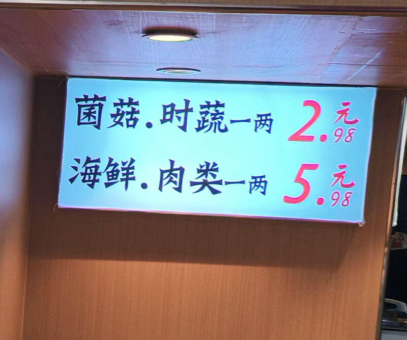 在天虹商场,以50克为计量单位的餐饮门店不止一家。离杨国福麻辣烫很近的遛巷麻辣香锅,菌菇、时蔬一两卖2.98元,海鲜、肉类一两卖5.98元。而且,整个价目表上,“一两”的字体偏小,数字“2”和“5”特意用了红色而且字体最大。“.98”就像要藏起来一样,很不显眼。在消费心理学中,人们更愿意买价格是2.98元、2.99元的东西,而不买3.00元的东西,尽管实际价格相差无几。这种“左位效应”,体现左位数字对认知判断的支配作用。这家麻辣香锅,特意将左位数字做了加大处理,右位数字缩小,把“左位效应”玩到极致。