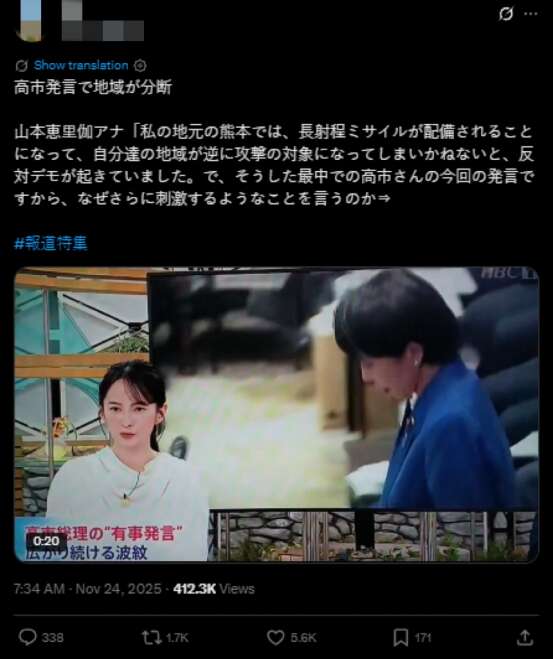 在社交媒体平台上,一名网友援引日本主播的评论表示:“在我的家乡熊本,由于(日本政府)决定部署长程导弹,当地已出现抗议集会。在此风口浪尖,高市却发表此番言论——(人们不禁质疑)她为何要火上浇油?”