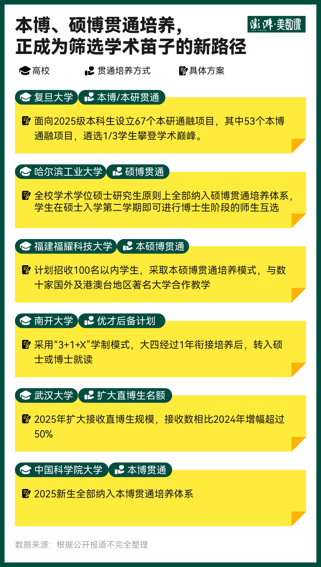 因此,传统学科学硕缩招并不等同于式微,而是开始追求“少而精”,主要以培养致力于走上学术道路的研究型人才为主。许多学校已经开始做出改革,开启学硕-博士贯通政策,部分名校甚至倾向于从本科就开始“掐尖”筛选学术人才,扩大直博生名额或本硕博贯通培养名额。