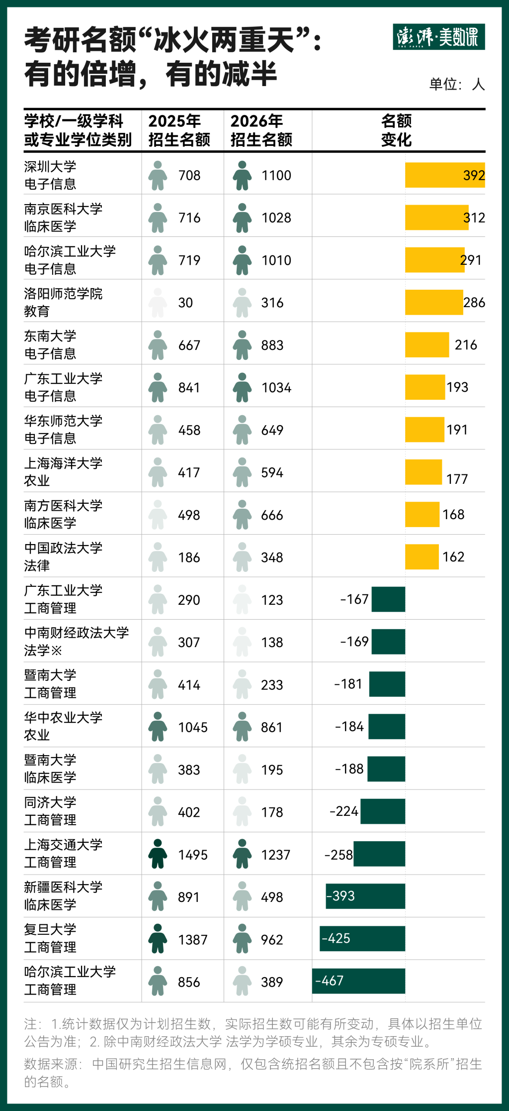 数据显示,招生名额的变动在不同招生项目间区别较大。深圳大学电子信息专业今年比去年扩招392人,而哈尔滨工业大学的工商管理专业缩招超50%。据《中国新闻周刊》报道,部分高校招生名额的“缩水”,让一些备考已久的考生不得不考虑更改考研计划。