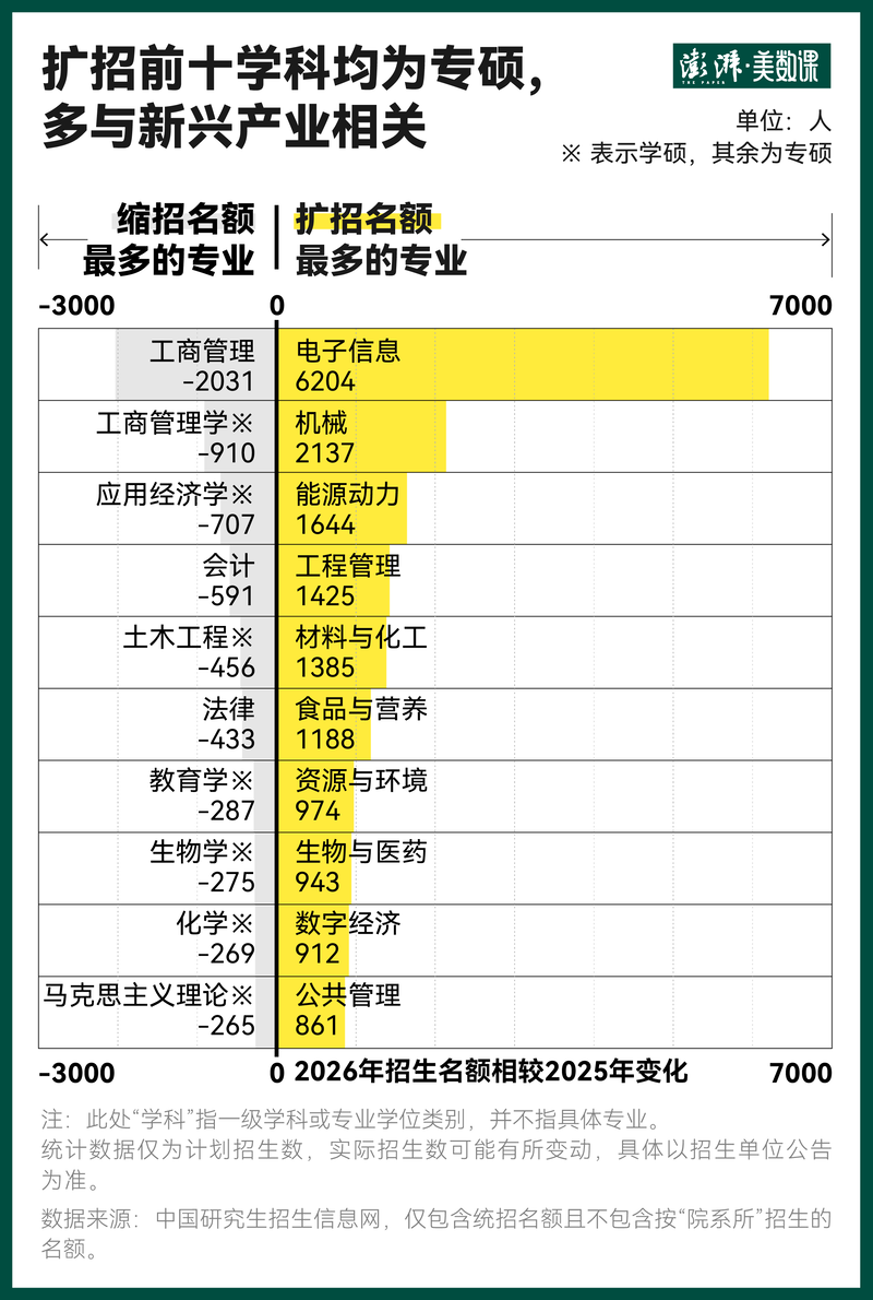 澎湃美数课基于教育部高校学生司创立的中国研究生招生信息网公布的硕士专业目录,梳理了2025年、2026年两届研究生招生计划目录中二十余万条招生信息,发现今年统招名额的扩大主要在专硕上,其中,工学类专硕名额增幅超过一万三千人,占据近三分之二的扩招名额。