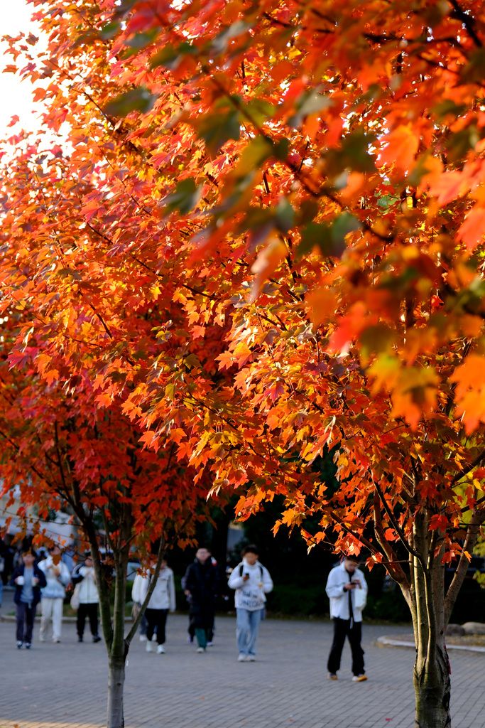 近期,长沙天气晴朗,湖南农业大学的枫叶绯红,迷人的“枫”景吸引众多游客前来欣赏冬日美景。