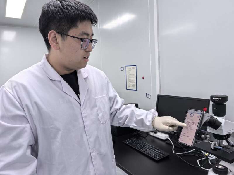 将手机架在显微镜前,上传图像,只需要3秒,真菌检测App便给出了识别结果。在丹娜(天津)生物科技股份有限公司一楼实验室,博士后吴秀祯正在进行试验。这套检测系统能帮助医生快速识别出25种真菌,覆盖了临床90%的常见菌类。