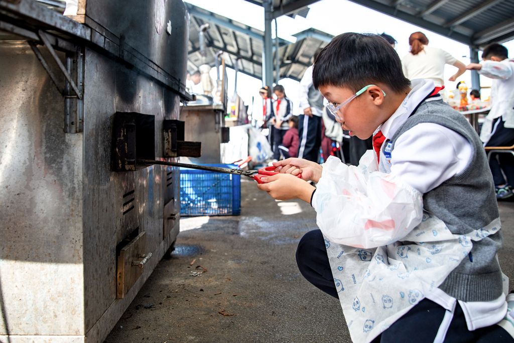 2025年11月25日,浙江省温州市,鹿城区学生实践营地,来自温州市第二实验小学的学生在这里烧火炒菜,在袅袅炊烟中感受劳动的价值和乐趣。