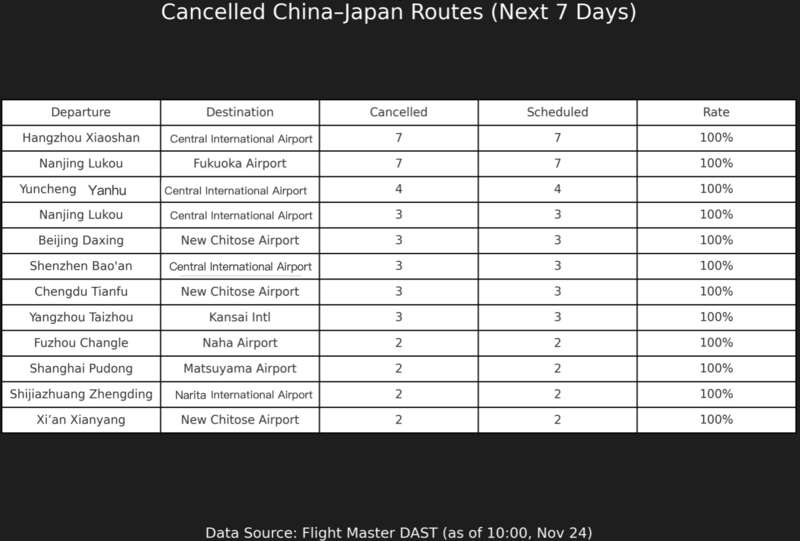 According to data from the travel platform Flight Master cited by The Paper, 12 China–Japan air routes—including those to Nagoya, Fukuoka, Sapporo and Osaka—had all flights canceled as of 10 a.m. on November 24. The cancellation rate for planned flights to Japan is expected to reach 21.6% on November 27, the highest in a month.