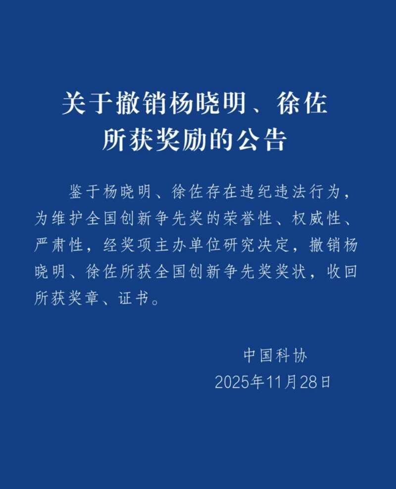 中国科协:杨晓明、徐佐存在违纪违法行为,撤销所获奖励