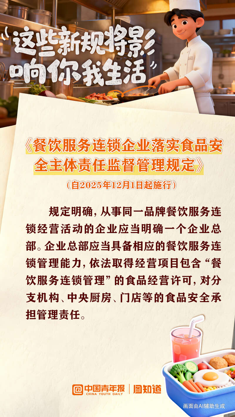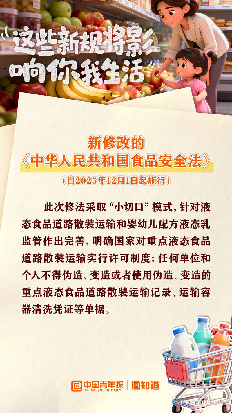新修改的食品安全法守护“舌尖上的安全”,“旧国标”电动自行车不得继续销售,餐饮服务连锁企业实行贯通式管理……2025年12月,这些新规将影响你我生活,多图速览!(整理/逯清钰 制图/董怡璇)