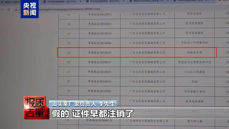 汕头某厂家负责人 李先生:假的,证件早都注销了,他们胆子也真大,冒用名义做的,我们在找证据告他。