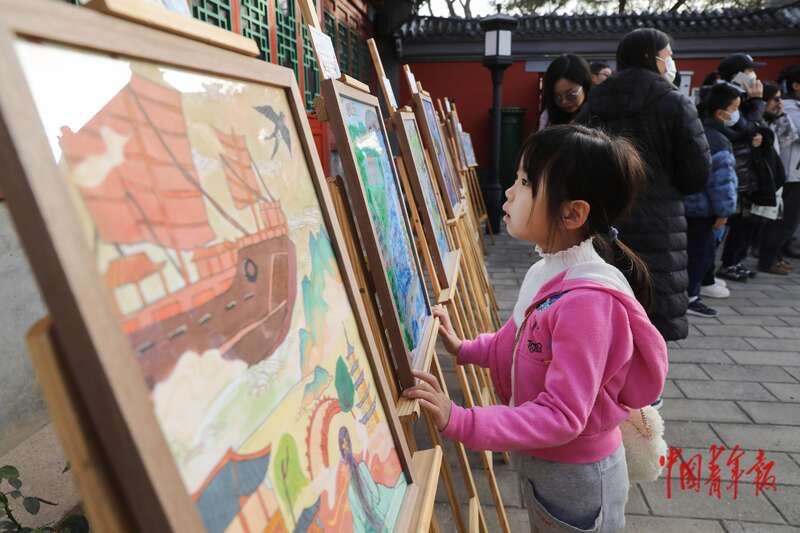 11月29日,北京郭守敬纪念馆,一名小游客在观看充满童趣的“运河奇妙游”绘画。当日,一场以“穿越千年的运河之美”为主题的青少年艺术与科技融合成果展在这里开幕,来自北京市第十三中学小学、初中、高中部的50件(组)学生作品展现了不同年龄段学生对运河文化的多元理解与传承。中青报·中青网记者 孔斯琪/摄