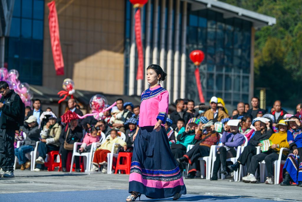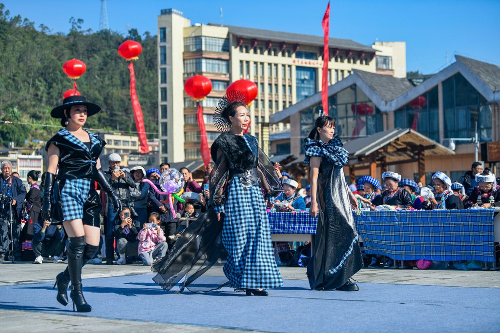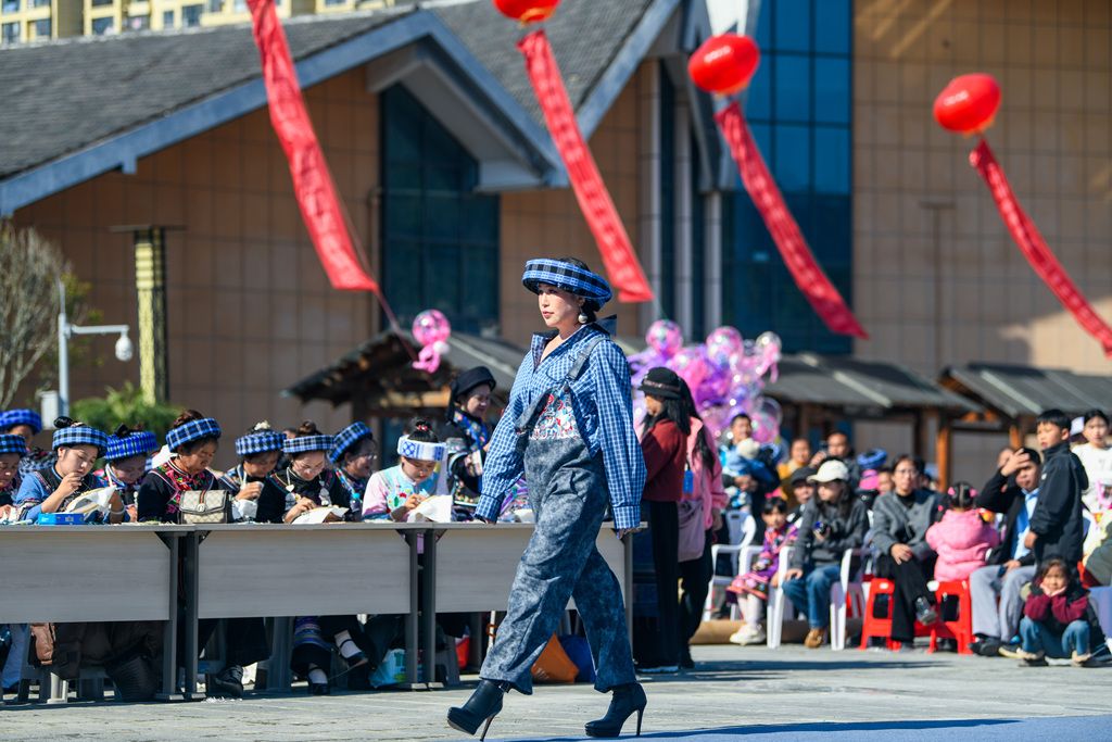 2025年11月30日,贵州省黔西南州,模特在册亨县纳福广场展示带有布依族元素的服饰。