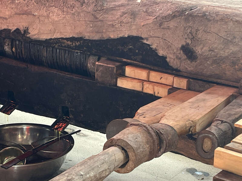 开榨现场,常山喝彩歌谣国家级非物质文化遗产代表性传承人曾令兵高亢喝彩,舞龙舞狮欢腾跃动,唢呐声悠扬回荡,依次展示油茶树“春萌芽祈福”“夏繁枝喝彩”“秋硕果庆丰”“冬开榨纳福”四个主题。在传统榨油坊内,烘焙茶籽的浓郁香气扑鼻而来,曾令兵以古老仪式祈愿丰收。榨油师傅推动木榨,金黄色的山茶油缓缓流出。