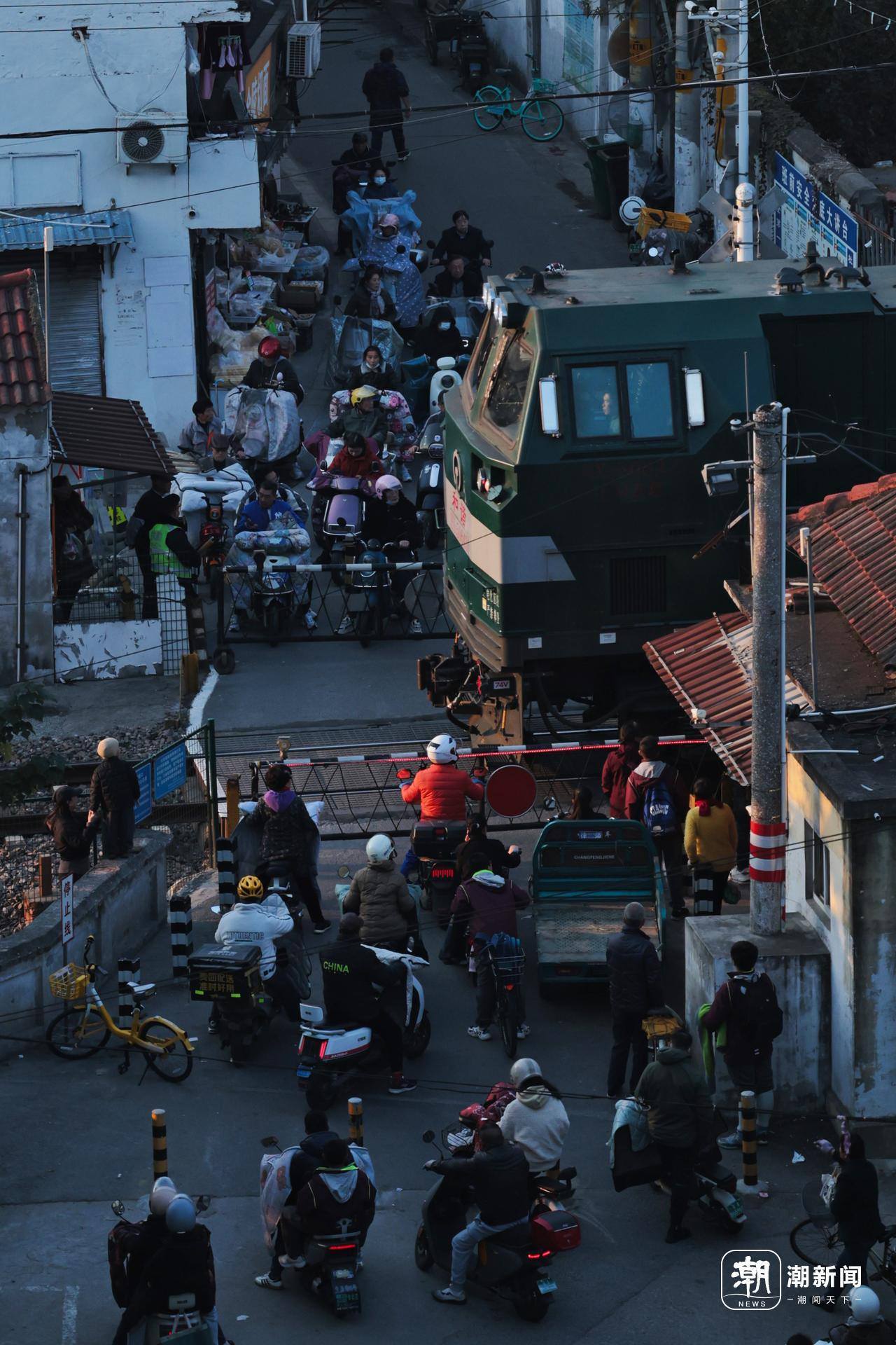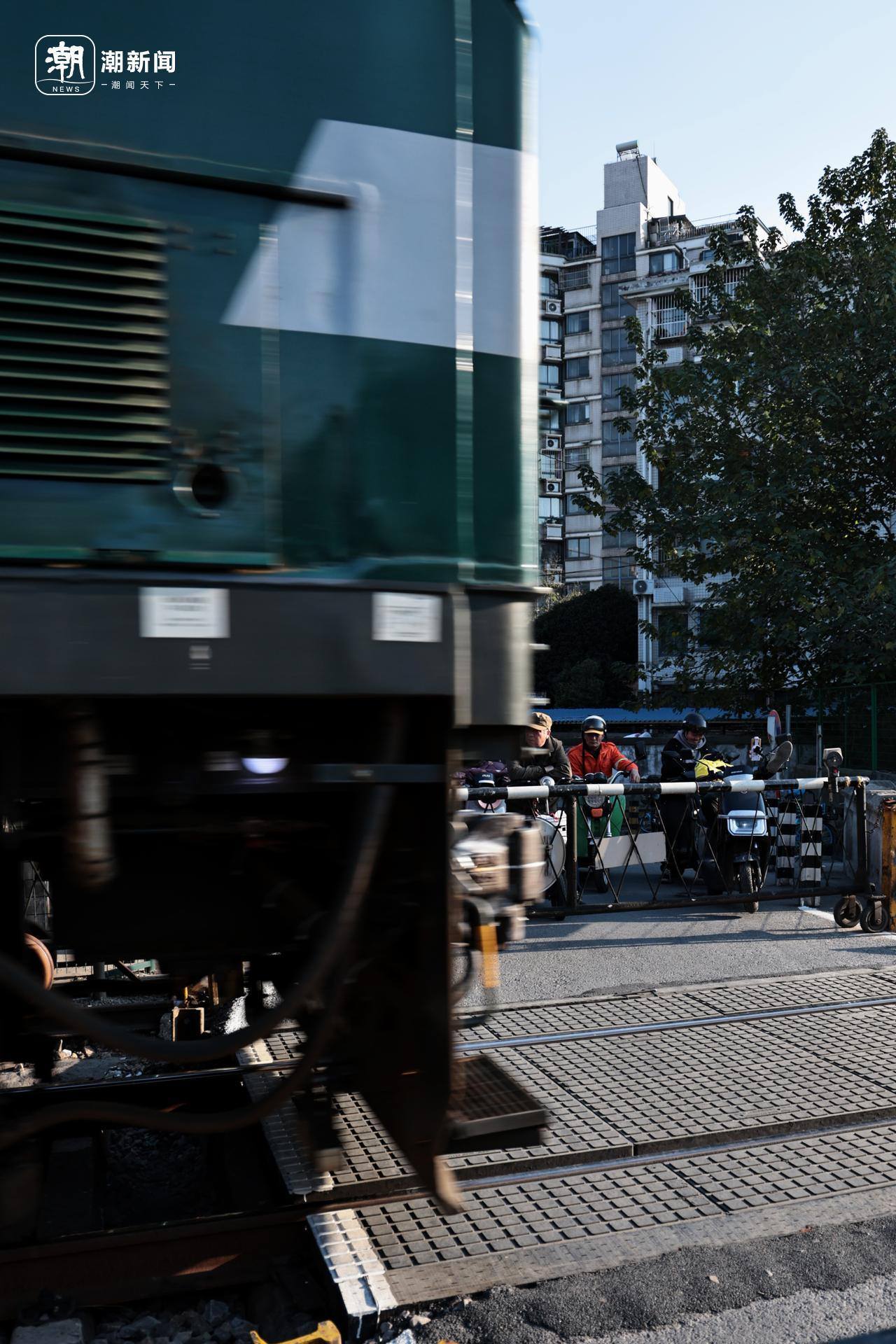 南京市宁芜铁路沿线的一个节点,骑车的市民正在等待火车通过 潮新闻记者 于诗奇摄
