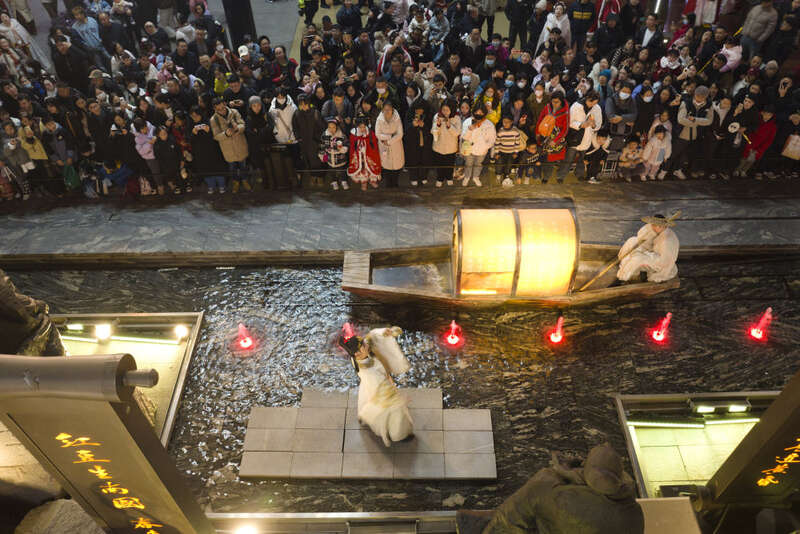 2024年5月12日,游客在西安长安十二时辰主题街区内观看演出。街区通过汉服旅拍、演艺互动、非遗体验等项目,让游客“穿越”回盛唐长安,为游客打造科技感、文化味十足的游历体验。