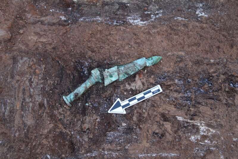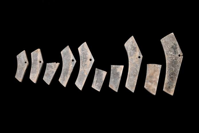 第二组墓葬中,M6、M7两座中型墓规模相当、距离相近、成对分布,推测为夫妻异穴合葬墓。M6随葬兵器,应为男性;M7随葬骨梳,应为女性。尽管遭严重盗扰,M6墓葬中仍出土包括铜鼎、铜剑、成套石编磬以及大量铜车马器构件和玉器、骨贝等262件器物。