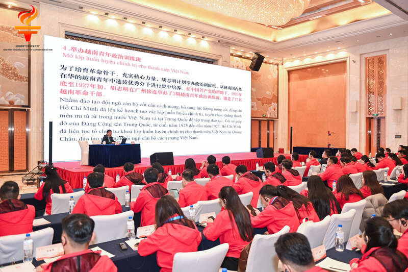 12月1日,云南昆明,参加越南青年来华“红色研学之旅”之“理想之光”研学营的越南青年听取《胡志明在中国》专题讲座,中央团校教授、共青团中央青运史档案馆馆长胡献忠为研学团授课。主办方供图