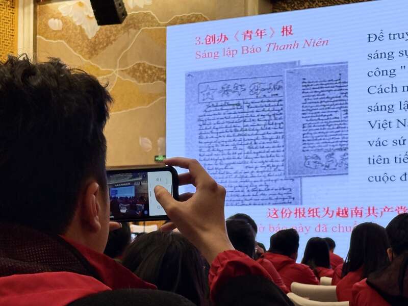 12月1日,云南昆明,越南青年听取《胡志明在中国》专题讲座。一位越南青年用手机拍摄幻灯片里关于越南共产党创办《青年》报的内容。中青报·中青网记者 马子倩/摄