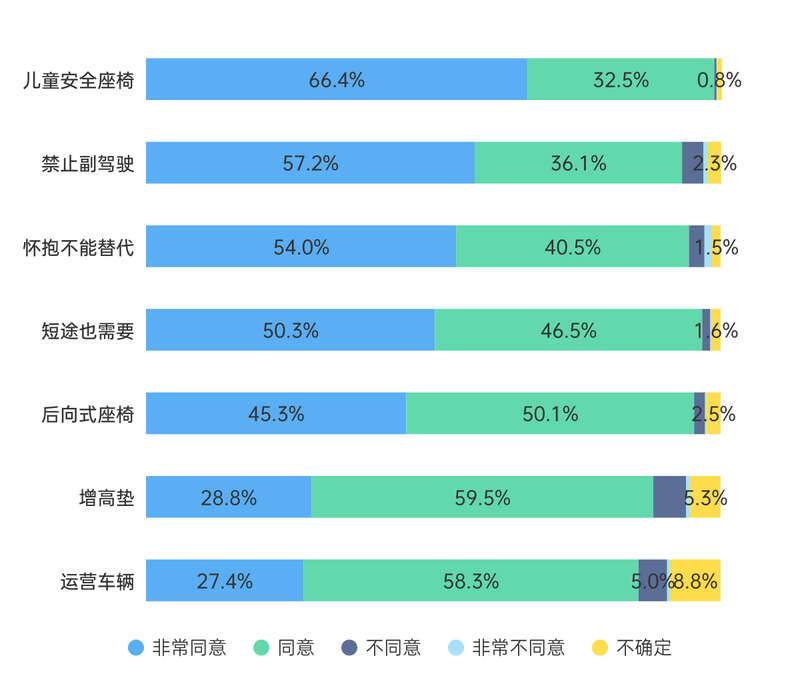 人大团队的调研显示,公众对儿童安全座椅的重要性认知较之往年提升明显,儿童乘车安全得到了广泛普及。98.9%的受访者明确认同,正确使用儿童安全座椅能显著降低交通事故中儿童的伤害与死亡风险。在具体安全认知上,94.5%的受访者认可“怀抱不能替代座椅”,96.8%支持“短途也需要使用座椅”,93.3%赞成“12岁以下儿童禁止坐副驾驶”,另外对婴幼儿用的后向式座椅、大童用的增高椅等细分产品的必要性认知率也分别达到95.4%和88.3%。