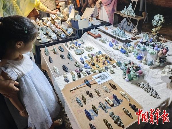 江西省景德镇陶溪川文创街区,街边摊位上展出的陶瓷工艺品。如今,有千年制瓷史的景德镇越来越年轻:陶瓷元素被融入更多日常物品如灯罩、香薰炉等,陶瓷本身也和漆艺、玻璃、金属等多种材质创新结合。中青报·中青网记者 朱彩云/摄