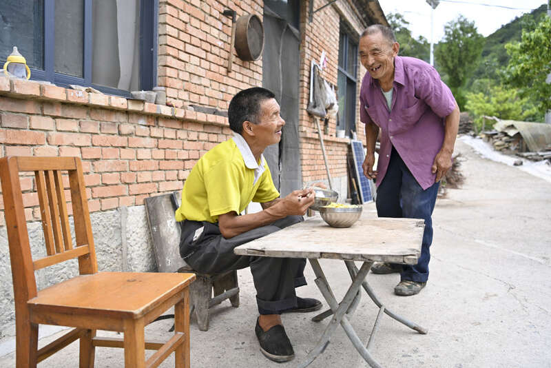 ↑村民元有才(右)为秦海松准备好午餐后,两人开心交流(2025年8月6日摄)。