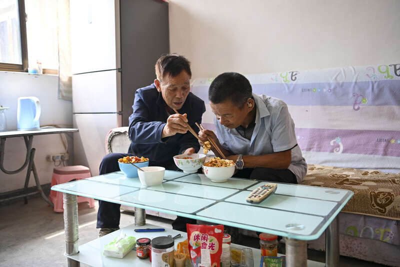 ↑村民程娇梅(右)为秦海松准备午饭(2025年10月11日摄)。