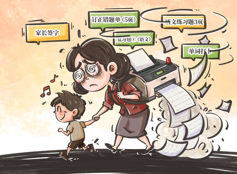 据报道,尽管教育部门三令五申要求减轻中小学生课业负担,并多次开展专项整治,一些地方学校依然“明减暗不减”,将大量电子作业通过微信群要求家长打印,动辄几十页,不仅让家长叫苦连连,也严重偏离“双减”初衷。打印机不应成为家庭“刚需”,社交软件更不能成为布置作业的隐蔽渠道。漫画:程璨