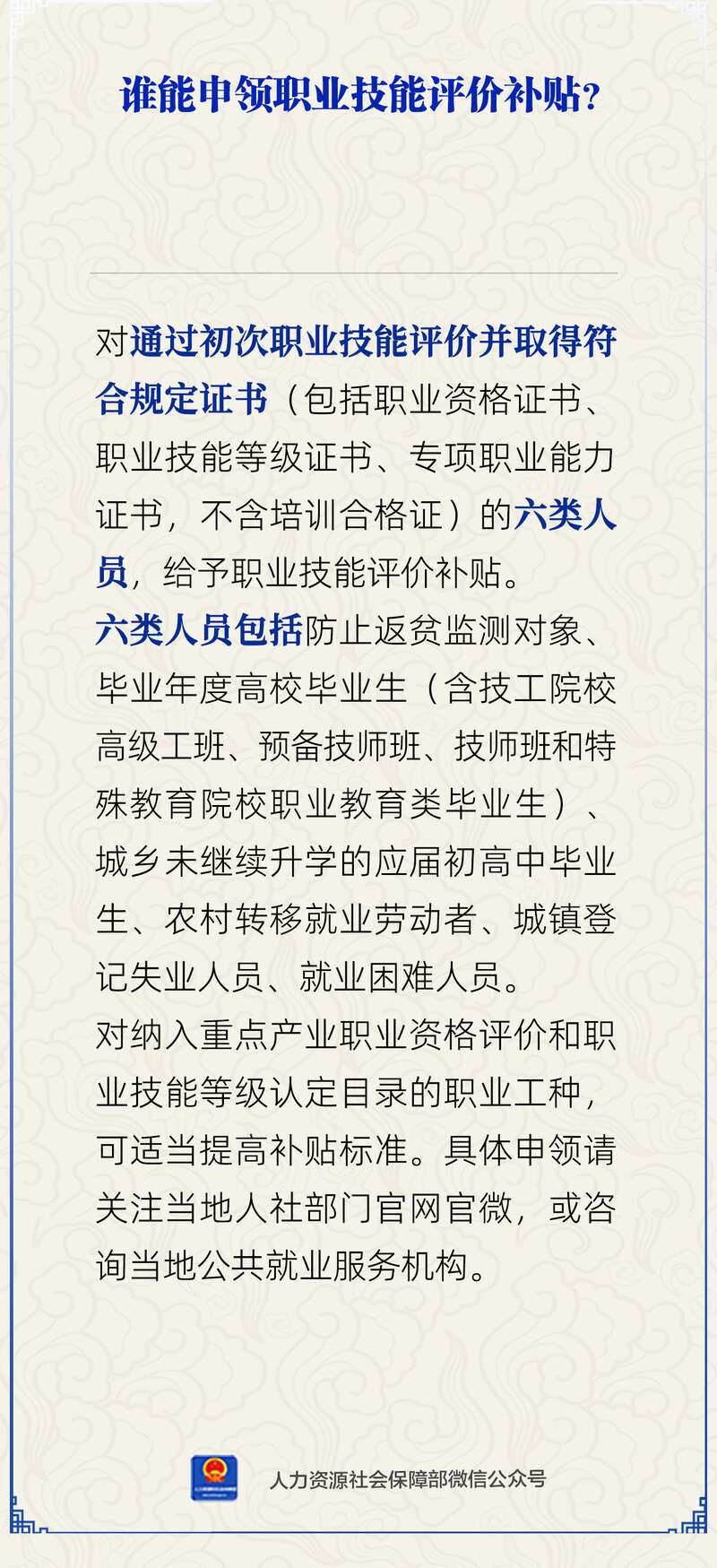 对通过初次职业技能评价并取得符合规定证书(包括职业资格证书、职业技能等级证书、专项职业能力证书,不含培训合格证)的六类人员,给予职业技能评价补贴。