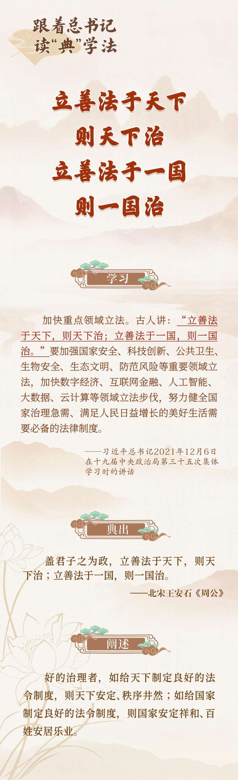 “源浚者流长,根深者叶茂。”中华优秀传统法律文化,承载着千年治国理政的智慧结晶,为当代中国法治建设注入深厚的文化底蕴。习近平总书记在多次讲话中运用法治典故析法明理,推动中华优秀传统法律文化实现创造性转化、创新性发展,使其由历史典籍中的法理智慧,发展成顺应时代所需的治国理念。