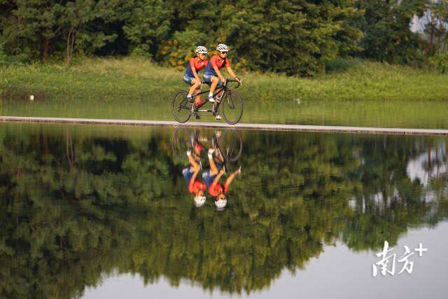 肇庆,杨晓婷(左一)与引导员谭嘉怡进行自行车训练。