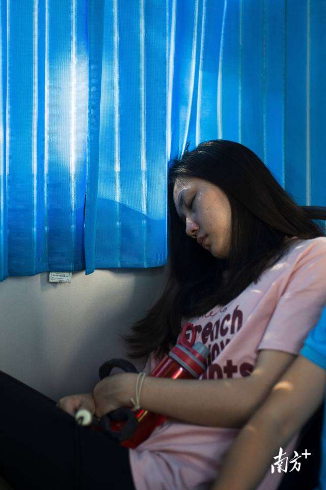 训练结束后,杨晓婷在接送大巴上睡着了。