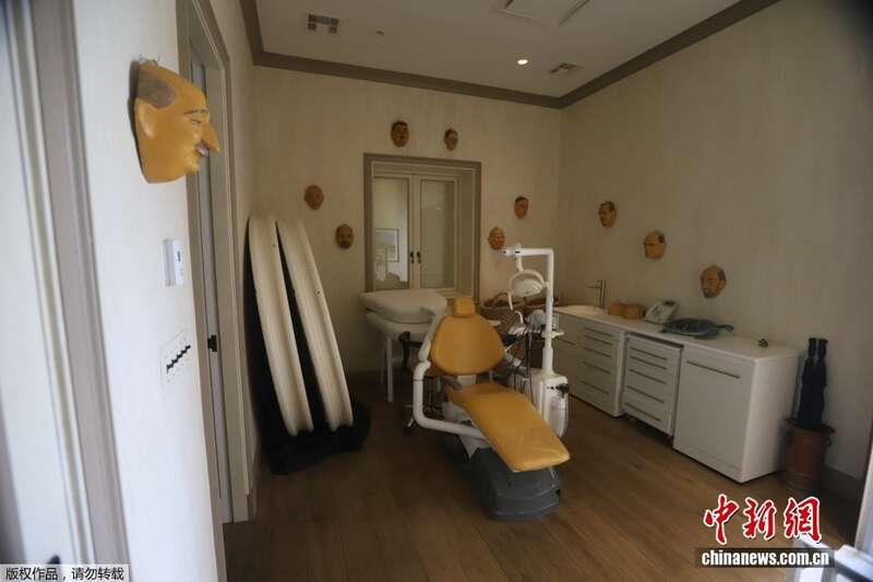 当地时间12月3日,路透社发布的一组照片曝光了由爱泼斯坦所拥有的美属维尔京群岛小圣詹姆斯岛上的场景,画面包括室外镜头与房间内部的景象。图为一个特殊房间的墙壁上悬挂着多个人像面具,其下方安装着一把牙医椅。