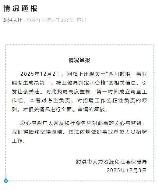 通报称,12月2日,网络上出现关于“四川射洪一事业编考生成绩第一,被卫健局判定不合格”的相关信息,引发社会关注。