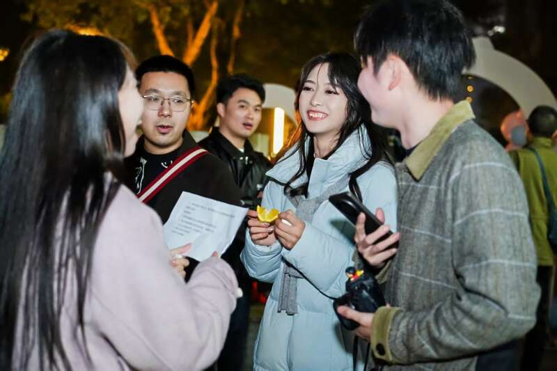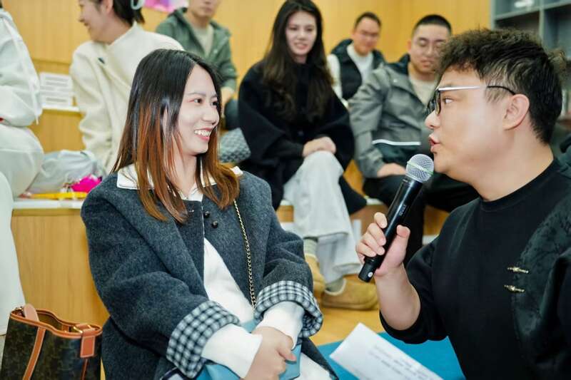 活动以“沉浸式社交场域构建”形式开启,通过“身份符号轻链接”“兴趣维度快匹配”开启互动,围绕生活美学、兴趣偏好等设置,整个环节以场域的自然流转为核心,让青年在松弛感中卸下社交防备。活动现场成为沉浸式“恋爱实验室”,每一张个性标签背后都是一份独特的情感样本,比如“旅行过20国”“社恐但努力”“养了三只猫的审计师”等个性标签,参与青年通过被随机抽取访谈的方式亮相。分组环节通过不同的规则与情境让即兴戏剧充满未知与乐趣。