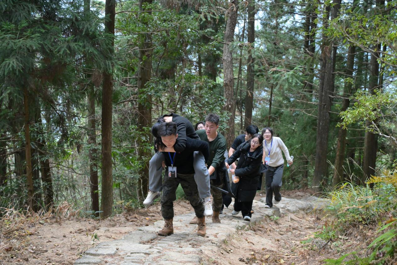 挑粮小道最陡处坡度超过45度,师生们相互扶持,稳步前行。“踩着挑粮小道上被岁月磨得发亮的石阶,山峰裹着草木的潮气扑在脸上,我忽然懂了课本里艰苦卓绝四个字的含义。它不是坚硬的文字,是鞋底硌着碎石的痛,是汗湿后背时的喘,是抬头望不见尽头的蜿蜒山路里,藏着当年红军担着上百斤粮食的身影。”经管学院谢鑫梦同学感慨道。