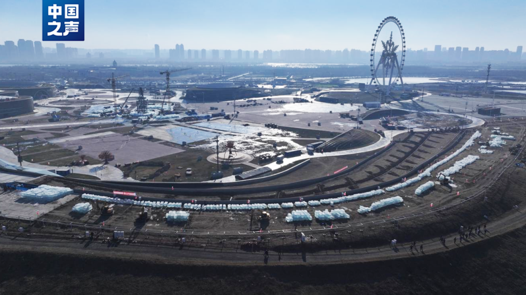 在城市的另一角,第二十七届哈尔滨冰雪大世界的建设现场同样热火朝天,近万名冰建工人在零下20℃的低温中加紧施工。