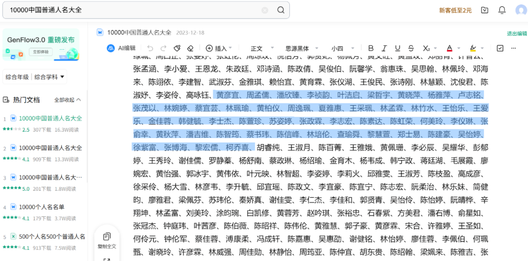 根据网友提供线索,名为“辽宁省科技企业知识转化平台”的网页,2024年9月30日发布的一份《2024年辽宁省非公有制高级职称评审通过人员名单公示》中,公示的58人中有48个名字和百度文库《10000中国普通人名大全》部分名单一致。