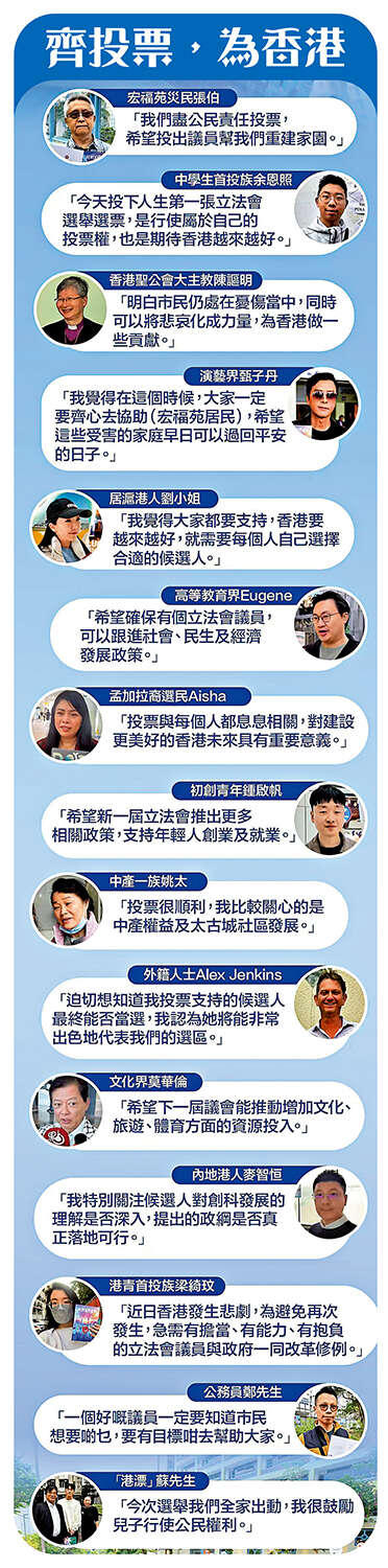 “选民络绎不绝……有选民表示,自己手中的选票,是对代议士的选择,也是对更美好家园的期盼。”《大公报》称,香港特区第八届立法会议员顺利诞生,是新选举制度下优质民主的一次成功实践,为香港加快迈向由治及兴提供了强大动能。