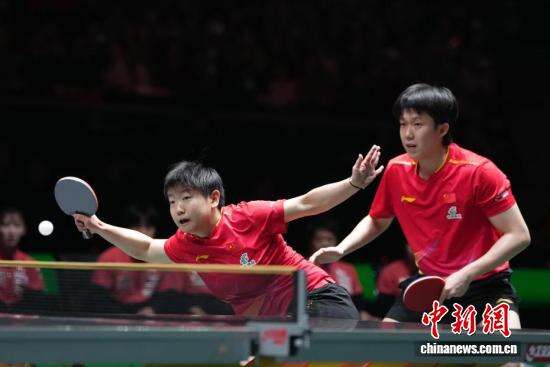 中国队队员孙颖莎(左)与王楚钦在混合双打比赛中。