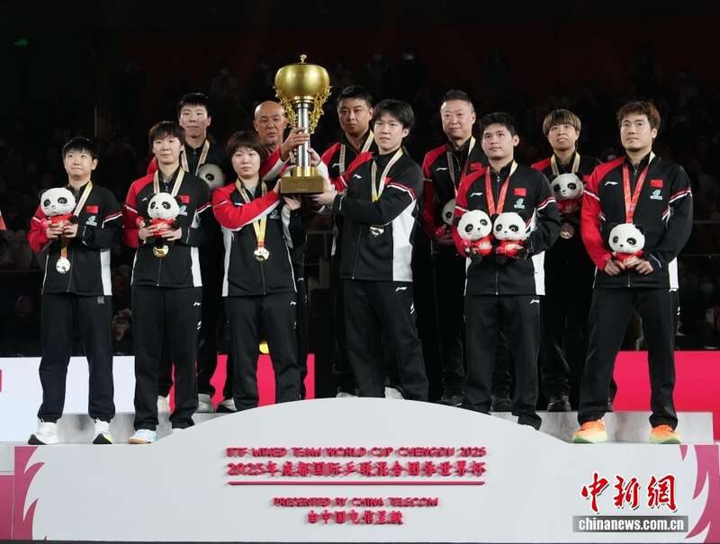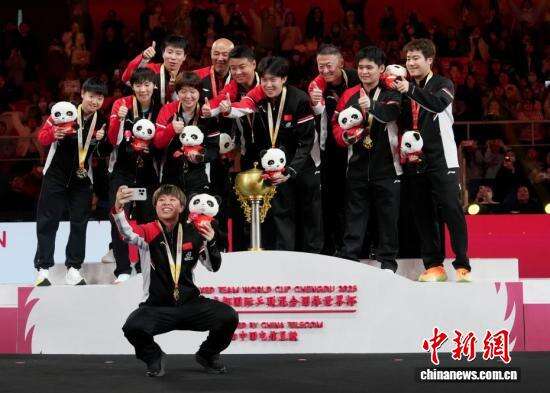 12月7日,四川成都,中国队队员在颁奖仪式现场拍照留念。当日,2025年成都国际乒联混合团体世界杯决赛比赛中,中国队以8:1战胜日本队获得冠军。