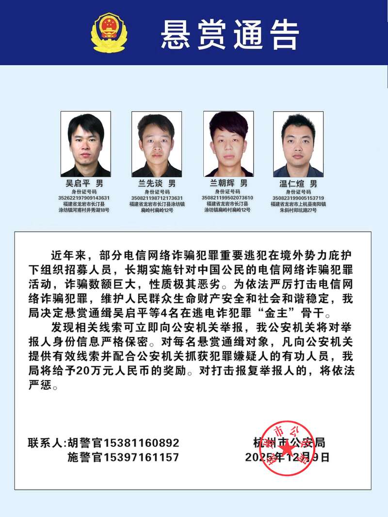 杭州市公安局发布的悬赏通告。公安部新闻宣传局供图