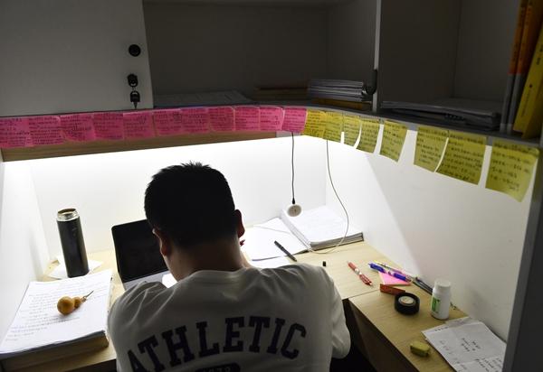从暑假开始,陆续有200多名备考生来到这里。他们多数是为了备战2026年全国硕士研究生招生考试,也有人的目标是公务员或事业单位。来此之前,有人考研失利,有人辞去工作,还有人已经结婚成家。一家自习室的经营者介绍,这里的最大特点是“杜绝干扰,闭关修炼”。他们为考生提供单人床、书桌、日常餐食,以及一处远离城市喧嚣的学习空间。备考生每天早晨8点进入自习室,晚上12点回到宿舍,除了午休和晚饭后的短暂放松,一天中十几个小时都与教材、习题为伴。