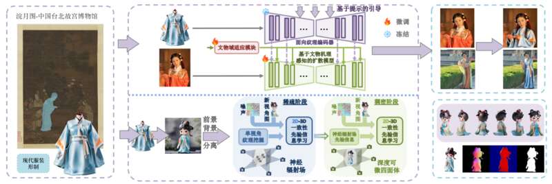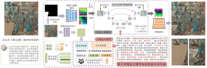 “我们国家的历史朝代多,不同时期的壁画、器物等都具有不同的历史特征,所以我们在前期花费了大量时间用于数据和信息的收集,整个过程需要反复验证,以保证修复后的准确度。”团队成员、博士二年级学生王子韬介绍,“对于壁画文物中无法考证的缺失部分,我们和华清宫文保中心联合提出了基于生成式大模型知识引导的壁画补全方法”。