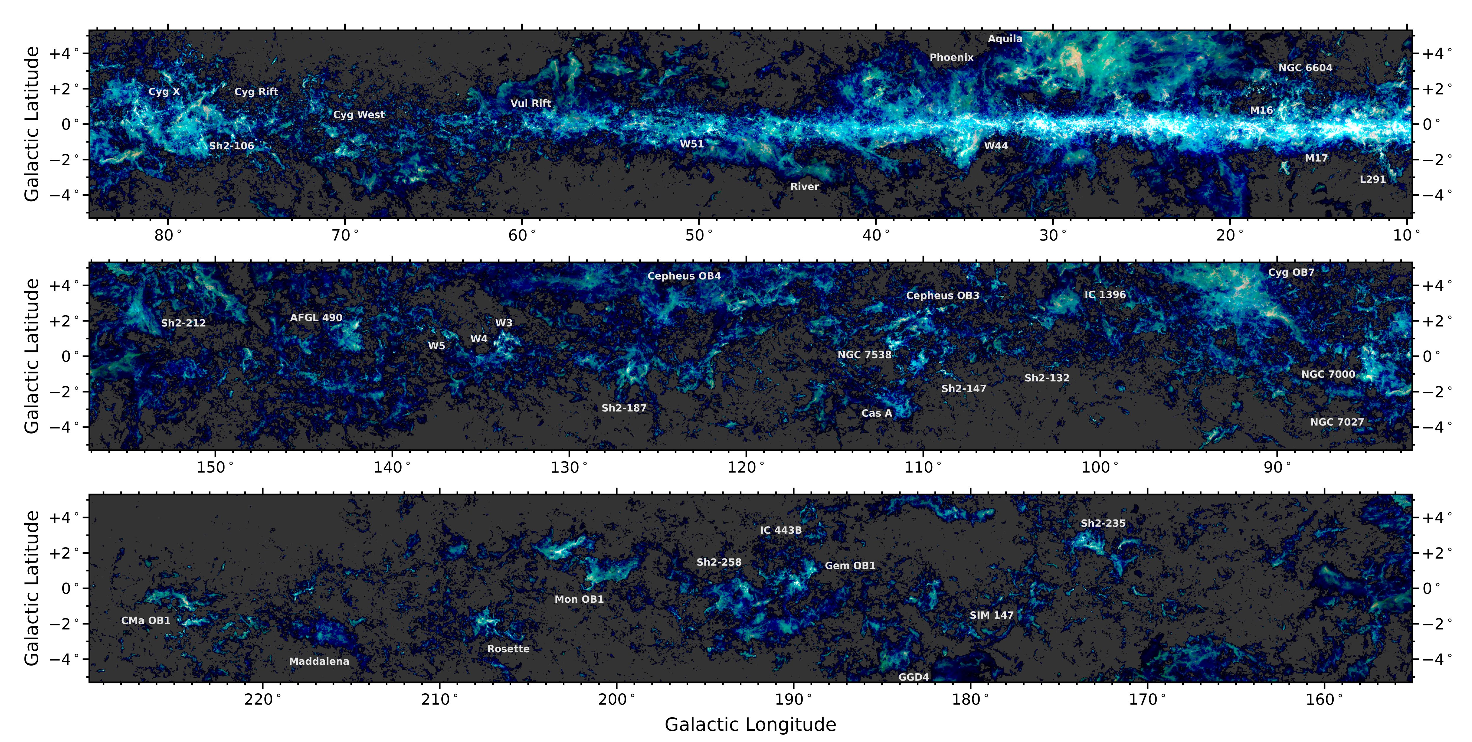 银河画卷C18O、13CO和12CO(1—0)数据合成的红、绿、蓝三色图。图中标识了著名的恒星形成区或气体结构。不同密度环境下的大尺度气体结构和形态各异的分子云细节清晰可见。
