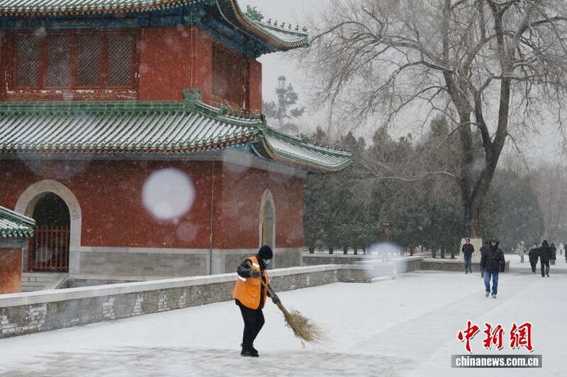 12月12日,北京城区出现明显降雪,市民在北京地坛公园内游览、赏雪。图为工作人员在地坛公园打扫积雪。