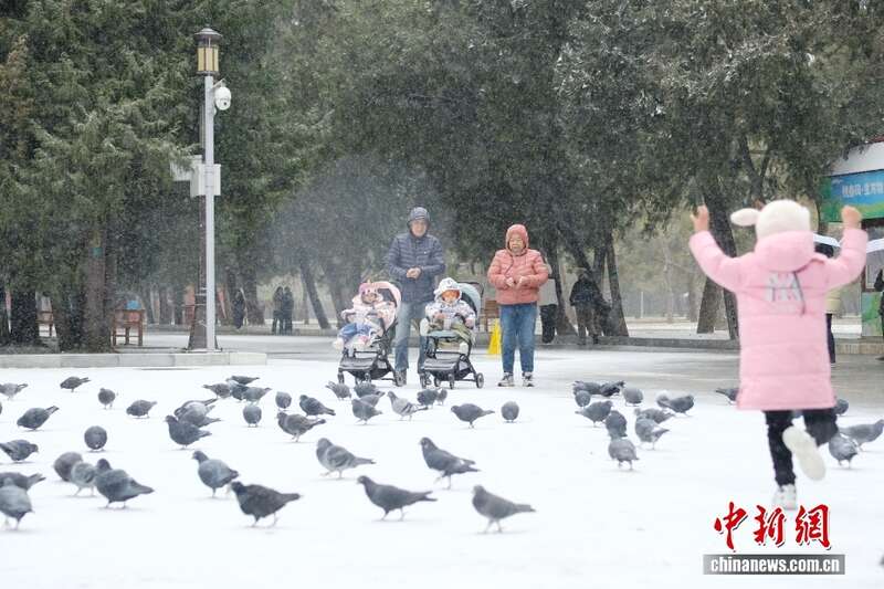 12月12日,北京城区出现明显降雪,市民在北京地坛公园内游览、赏雪。图为儿童在地坛公园玩耍。