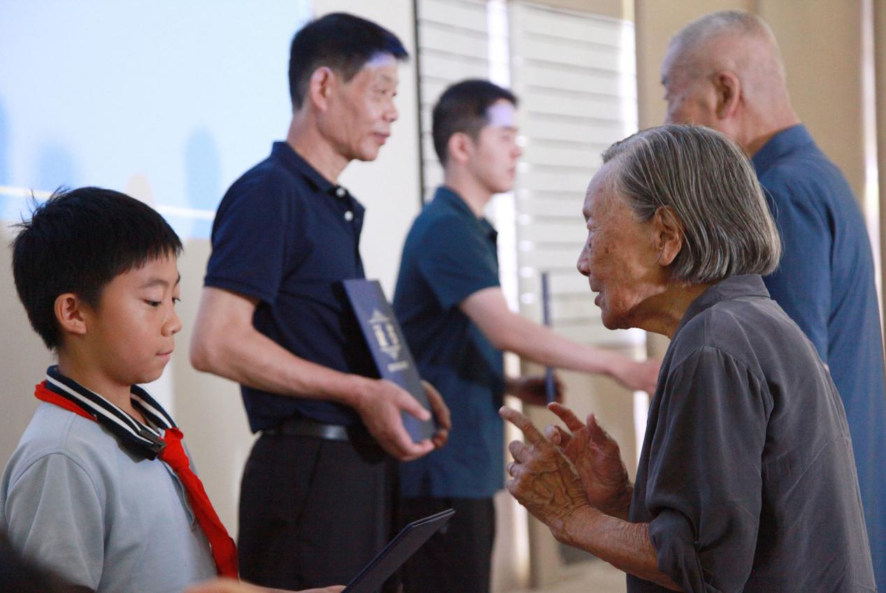 【南京大屠杀幸存者夏淑琴(右前)向曾外孙李玉瀚颁发“南京大屠杀历史记忆传承人”证书 图源:视觉中国】
