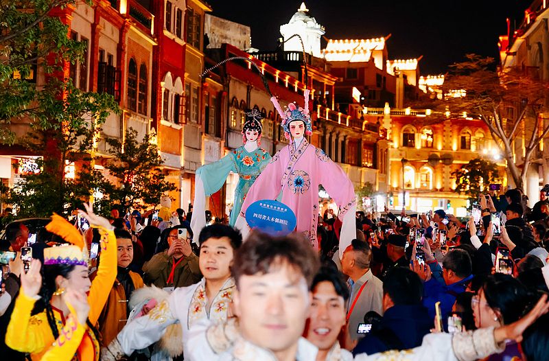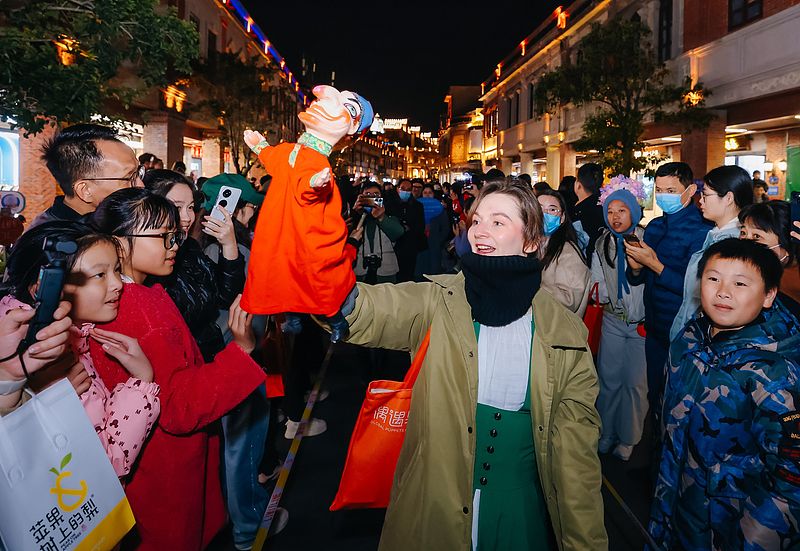 2025年12月14日晚,福建泉州古街区,参与泉州国际木偶展演的中外木偶表演团队在此巡游,与市民、游客互动。 中新社记者 王东明 摄