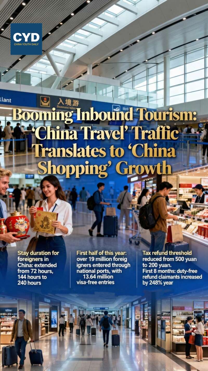 China is becoming even more traveler-friendly with visa-free stays extended to 240 hours, over 19 million foreign arrivals in the first half of the year—including 13.64 million visa-free entries and a lower ¥200 threshold for tax-free shopping that has driven a 248% surge in tax-refund users and 98% growth in refund sales, making China more open, convenient, and exciting than ever.